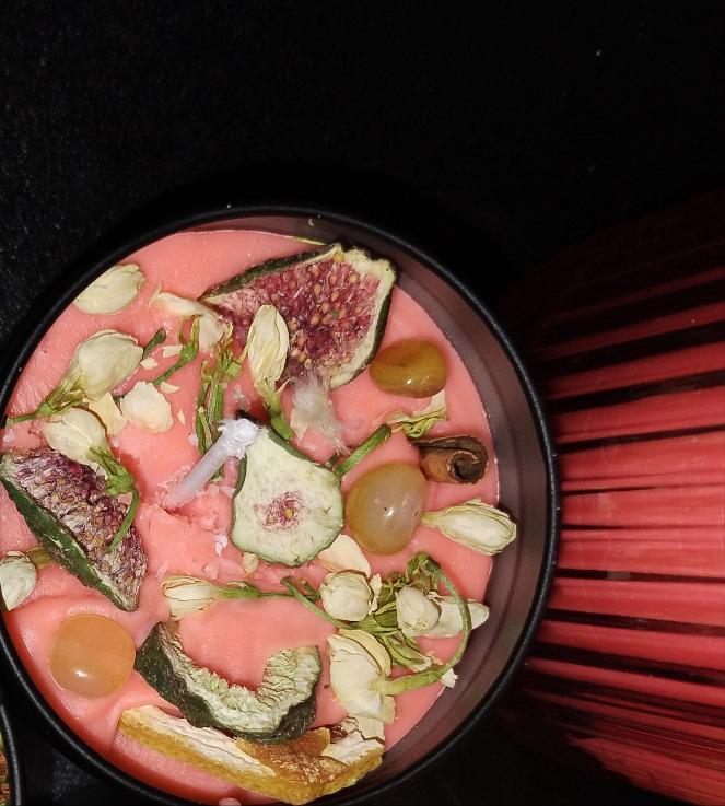 Discover inner peace and emotional balance with our newest candle. Infused with the scents of figs, yellow agate crystal,red gomphrena globosa flowers, and jasmine oils and buds, this candle promotes positive energy and confidence while balancing the solar plexus chakra. Experience enduring love, passion, and resilience with this divine blend.